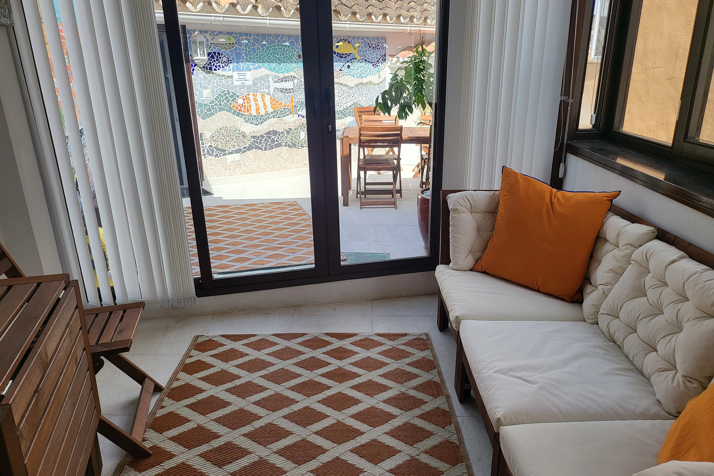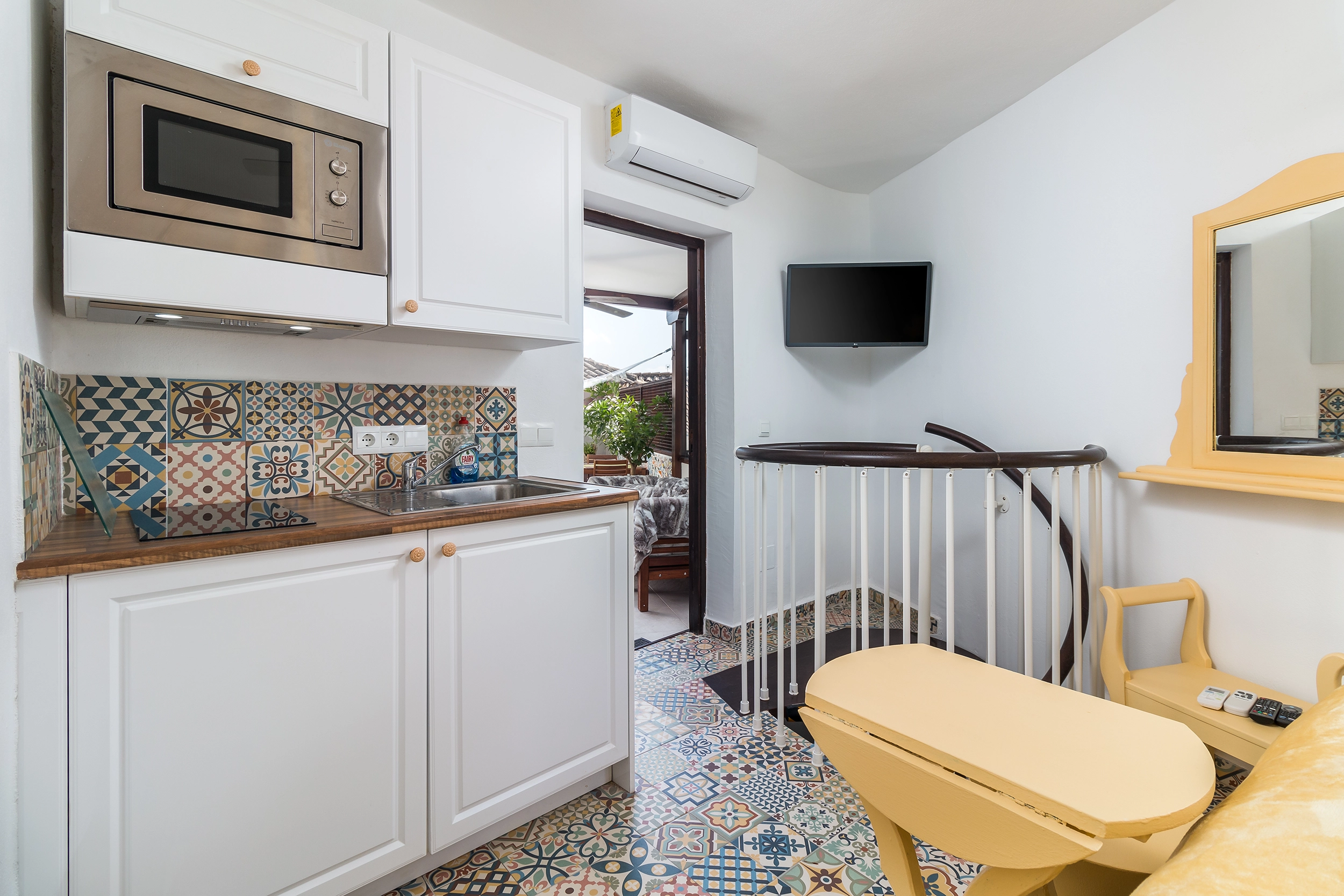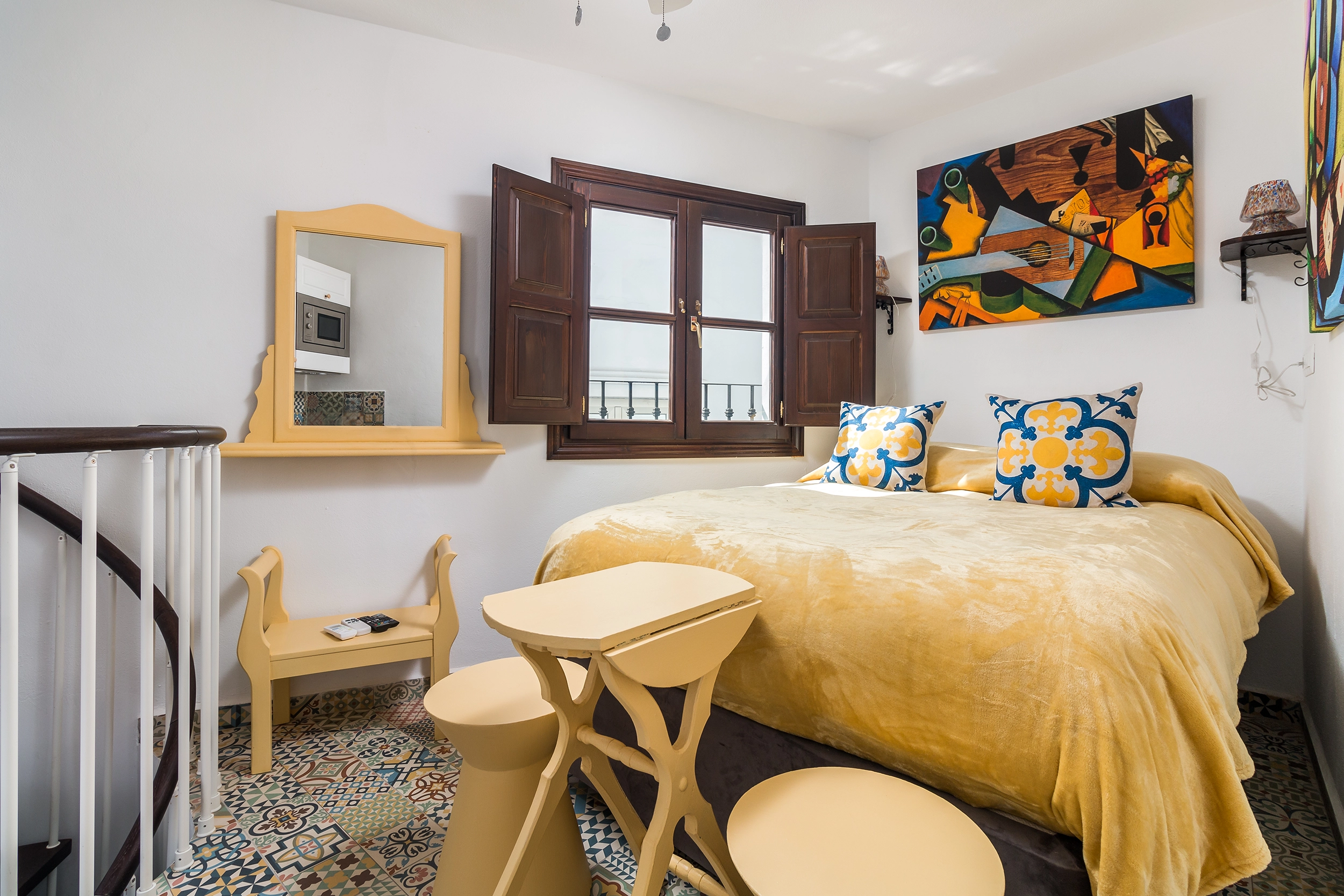 The quirky Duplex Gris is on the upper floor of Casa Florestos. This light and airy space is accessed via a rooftop sun terrace.