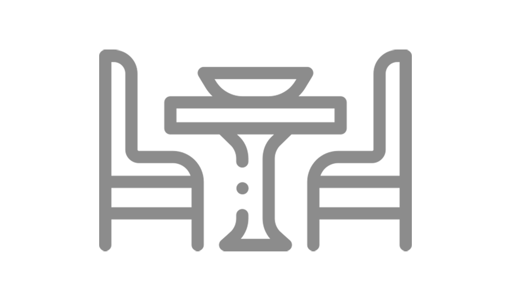 Small dining table and chairs, the dining area overlooking the flower-filled pedestrian walkway